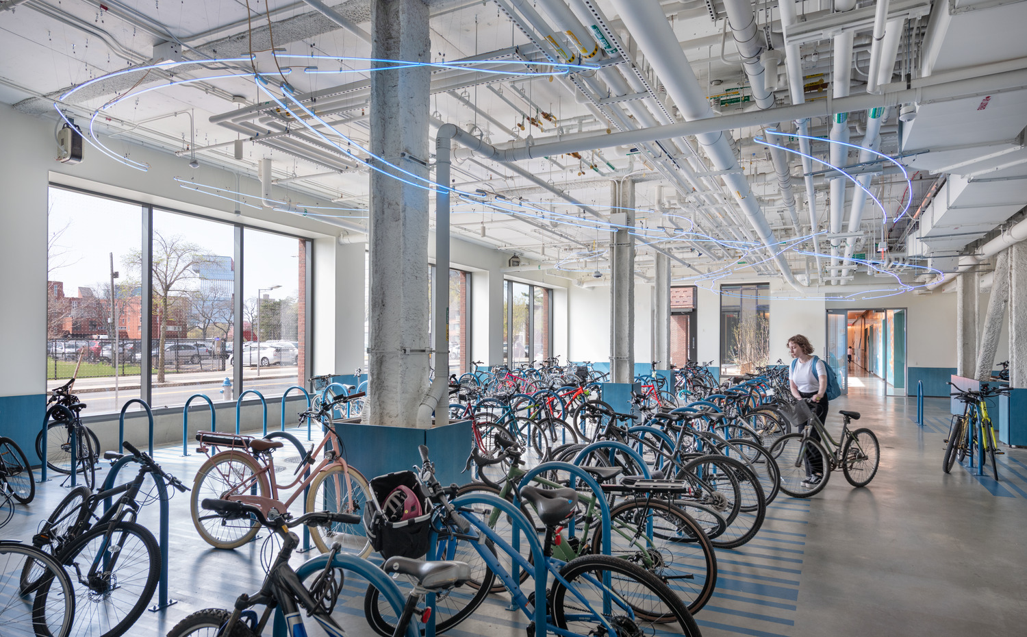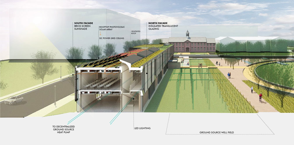 At the new Center for Building Energy Education & Innovation, a high level of sustainability is achieved through a decentralized mechanical strategy that uses groundwater-sourced heat pumps with energy recovery wheels, located between classrooms to maximize efficiency and provide opportunities for in-class observation and instruction. ©KieranTimberlake