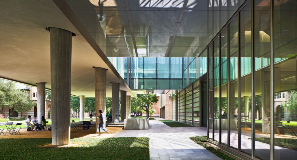 Several outdoor seating areas and a water feature encourage Rice University students and faculty members to linger in the shade of the buildings, extending the use of outdoor space in a hot climate. | Hester + Hardway