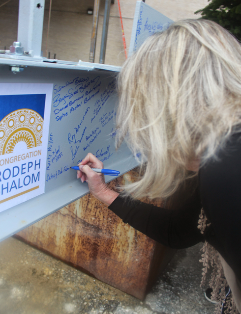 Community members at Philadelphia’s historic Rodeph Shalom synagogue sign their names to the highest steel beam to be placed in the new addition. Courtesy of Rodeph Shalom