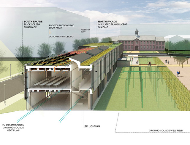 The federally-funded 27-member consortium led by Penn State University was the first Energy Innovation Hub created by the Obama administration. The goal of the project is to develop affordable tools for design, construction, and operation that will significantly reduce energy waste–and therefore costs–in commercial buildings under 250,000 square feet. Now, several years after its launch, the EEB Hub will try to prove its point by creating two demonstration projects–one retrofit and one new construction–on the Navy Yard campus. Both buildings, substantially funded through state grants given to Penn State during the Rendell administration, are expected to be open by spring 2014.