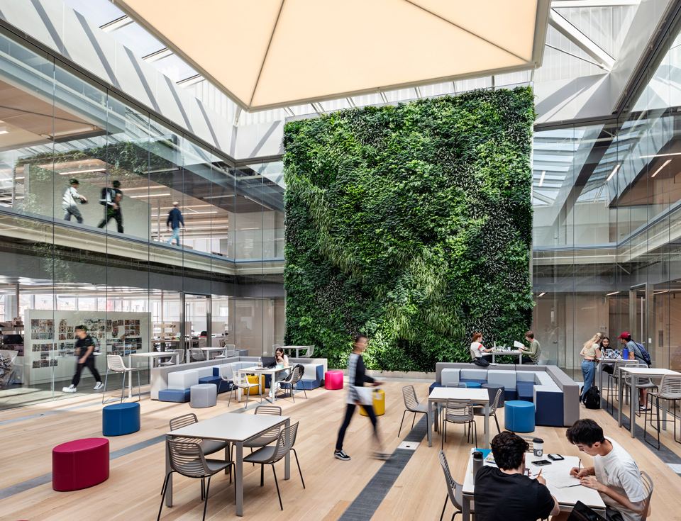 Inside the Sam Fox School of Design & Visual Arts’ new Anabeth and John Weil Hall, a 30-foot living wall. Designed in collaboration with Sagegreenlife, the vertical garden is inspired by the Mississippi and Missouri rivers. | Photo by James Ewing | JBSA
