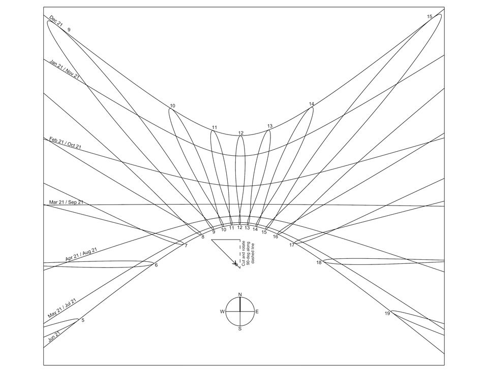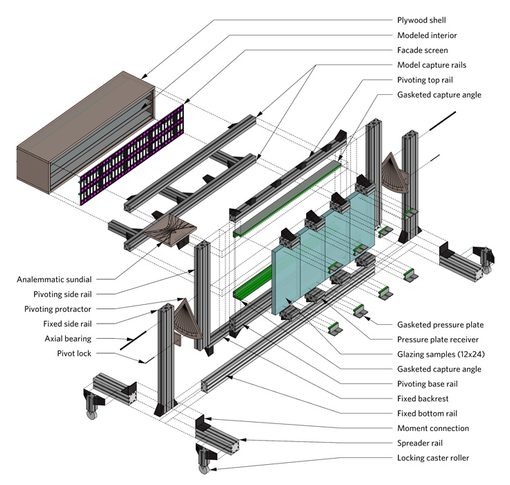 In response to these issues, we developed a custom device for studying glass details in their appropriate lighting context. The adjustable device comprises a pivoting Bosch Rexroth frame to which a model of a building interior and up to four glass samples can be attached. The frame is mounted on rolling casters and contains an internal pivot, which allows us to modify both the azimuth and inclination of the glazing samples relative to the sun. Using an analemmatic sundial calibrated to our project’s latitude, we can replicate the solar position for any desired time of day, date, and facade orientation.