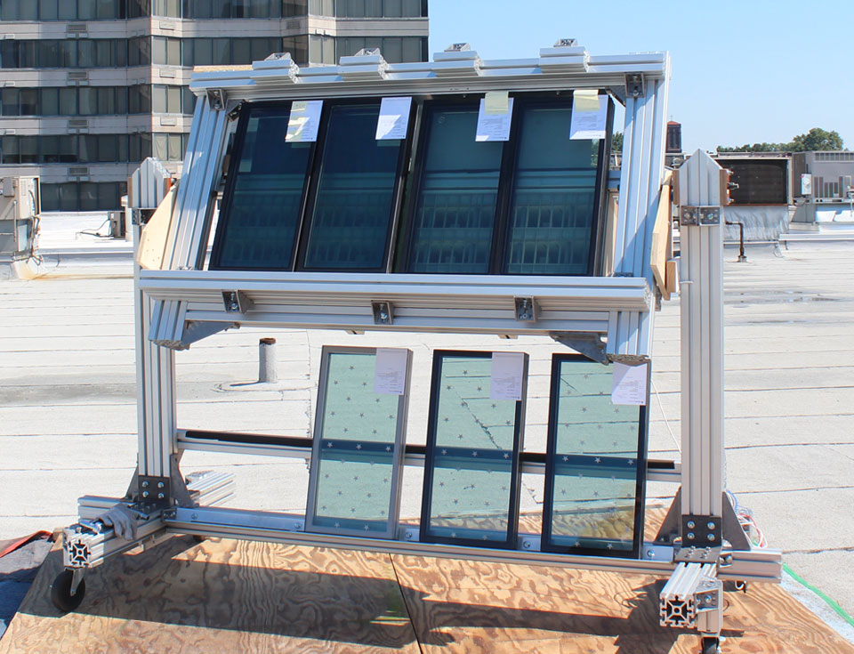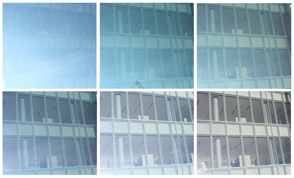 Under the same daylight conditions, different glass samples exhibit varying reflectivity and color shift (samples are shown positioned in front of a model of a building interior).