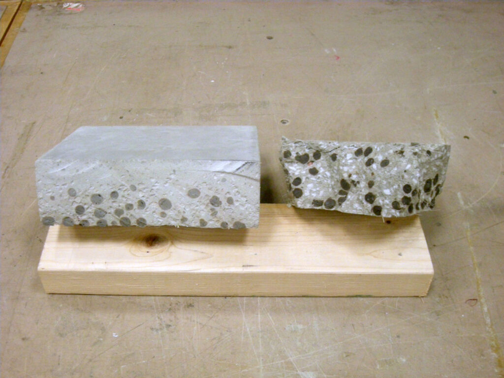 We built mockups with five different lightweight aggregates, and a series of twelve mixes incorporating both conventional and lightweight aggregates. Each mix was cast to determine workability, finish, and dry weight. Perlite, vermiculite, foamed glass, expanded clay, and Elemix EPS Foam were tested. Additionally, we tried three types of PVA reinforcing fiber (sourced from Nycon).