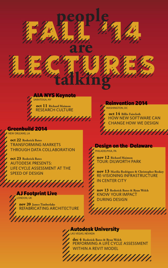 Topics for upcoming talks run the gamut from live demonstrations of our Tally LCA application, to an education session and tour of Dilworth Park, to a “power talk” by James Timberlake at AJ Footprint Live, a conference focusing on sustainability in cities.