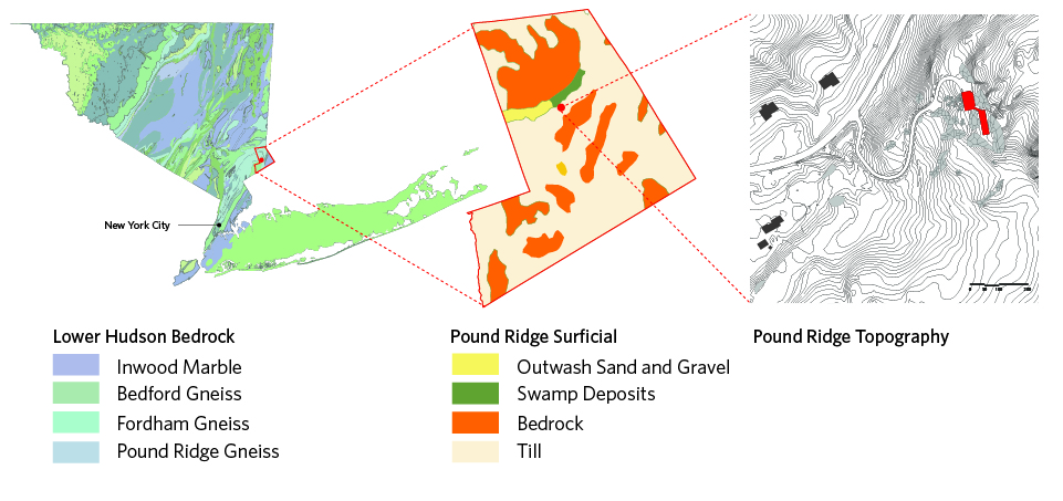 The town of Pound Ridge is representative of a unique and complex regional geologic history that extends back to some of the earliest rock formations on the East Coast (approximately 1 billion years ago) up to the most recent glacial event (approximately 15,000 years ago). Pound Ridge is one of the northernmost areas of the Manhattan Prong, the primary bedrock formation of Manhattan Island. As such, it contains the same granite gneiss formations that can be found in Manhattan’s Central Park and throughout the larger Highlands Province region that covers parts of New York, Connecticut, New Jersey, and Pennsylvania.