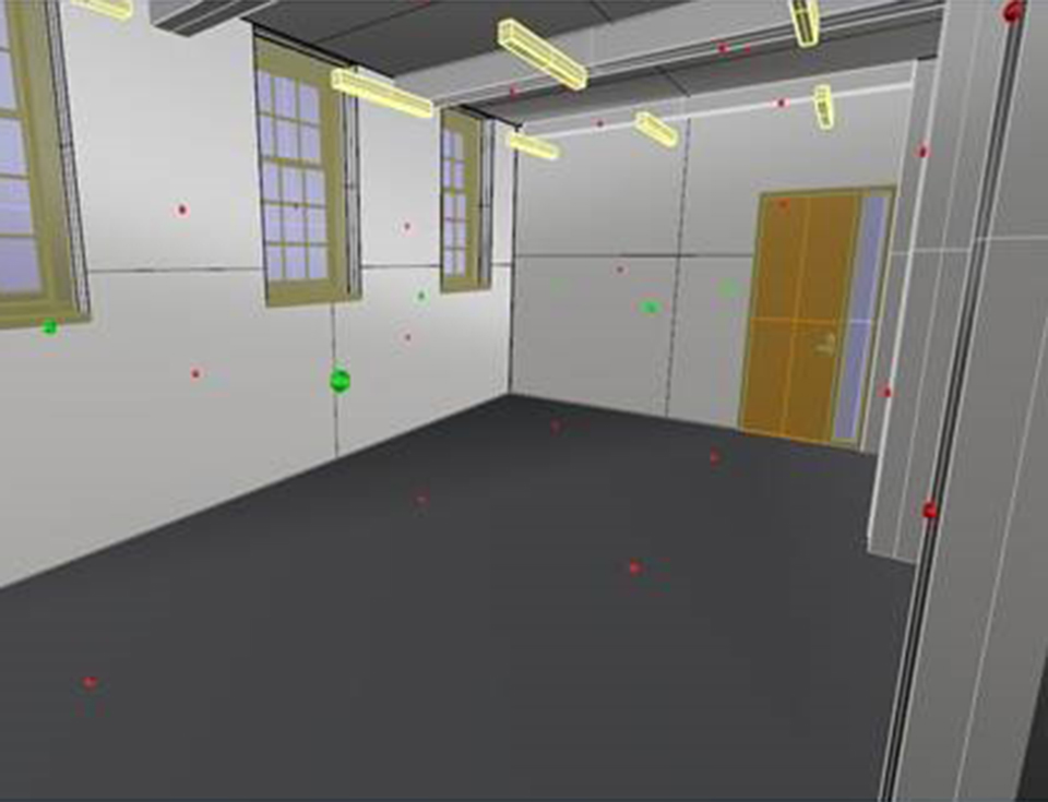 43 Pointelist temperature sensors were then placed on various surfaces throughout of the room, and 6 MRT ping pong ball sensors installed in the occupancy zone.