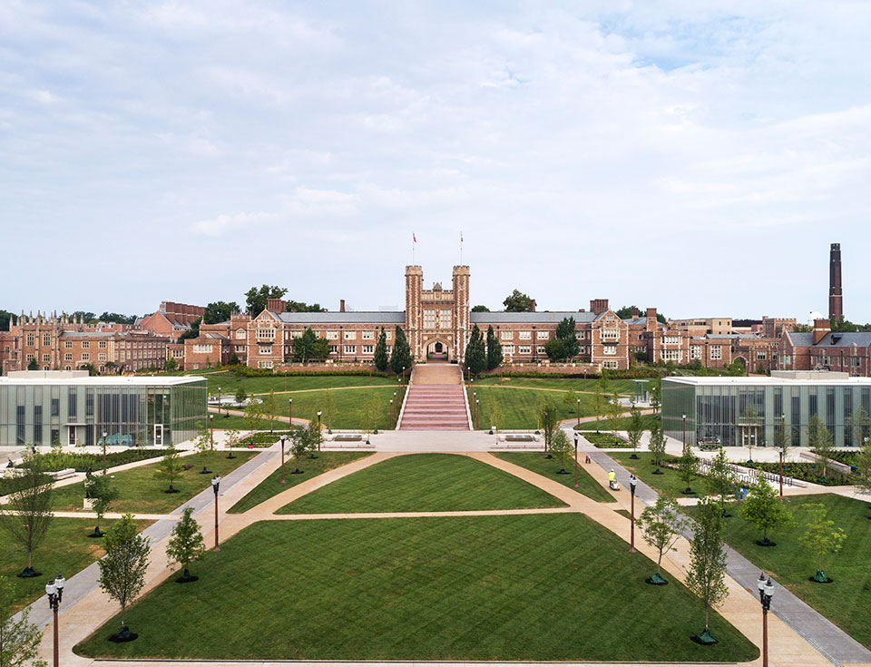 Washington University in St. Louis unveiled a renewed East Campus in 2019. It strengthens academic connections, enhances campus green space and circulation, and improves parking and accessibility for the university at large. ©James Ewing/OTTO