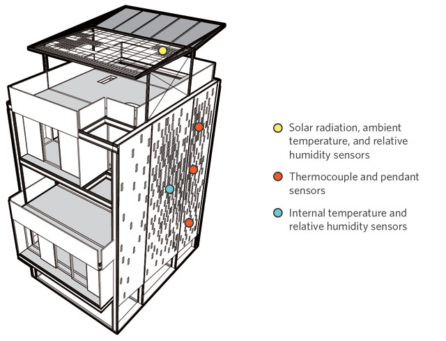 How well does a plastic building envelope function in the summer heat of New York City? We attached sensors to the house to collect data on the thermal performance of our SmartWrap™ building skin.