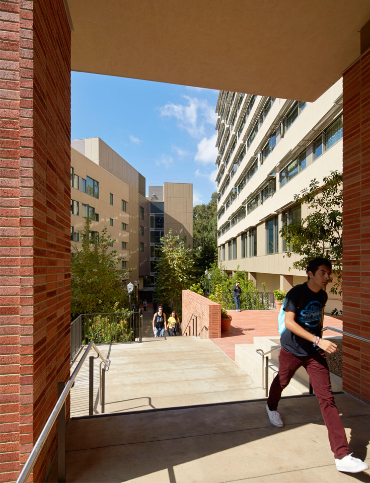 The completion of this work has created a new student-centered precinct and fulfilled the university’s mission to provide economical housing for undergraduate students. It is also the largest LEED Gold project at UCLA, achieved through close collaboration between the design team and university leadership. High-performance glazing, reflective roofing, increased insulation R value at the building’s exterior, and sun shading devices at the windows are some features that contributed to this rating. Site strategies included building orientation, stormwater filtration and retention, drought-resistant landscaping, and locally manufactured paving.