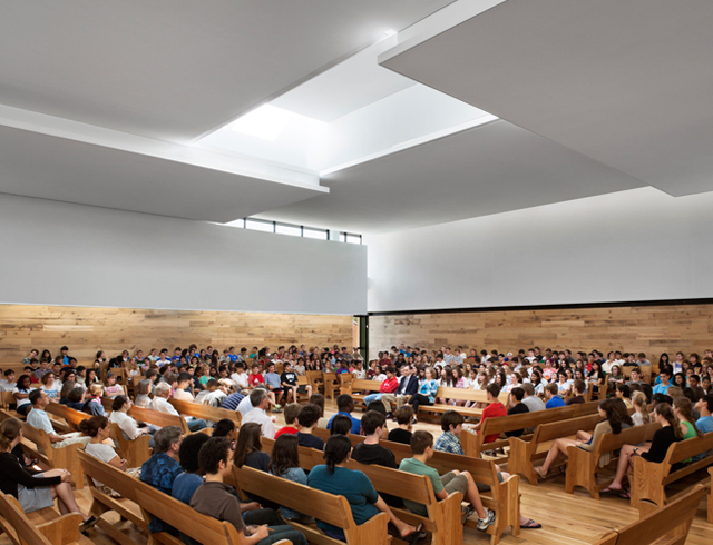 The Quaker Meeting House at Sidwell Friends School transforms an aging gymnasium into a carefully tuned space for worship and contemplation. More images are available here. © Michael Moran/OTTO