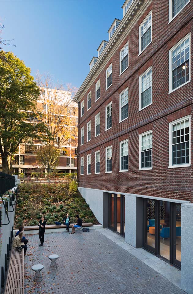 The renovation work at Stone Hall updates an 80 year-old building for the 21st century. A new feature is a terrace designed to create an outdoor gathering space for students beyond the new common room and social corridor on the building’s lower level, which was previously under-utilized space. © Michael Moran/OTTO