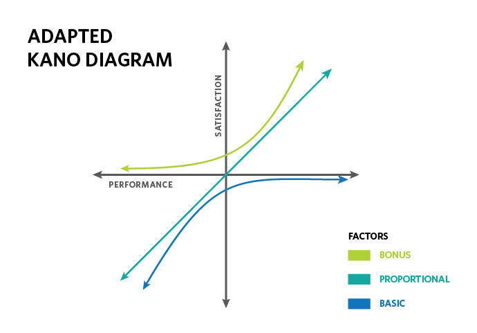 CURRENT TRENDS: Although this form of POE was previously used primarily as a way to investigate the causes of SBS and improve worker productivity, it is now having broader application in education. One of the most useful classifications2 relates IEQ satisfaction to Key Performance Indicators used in Kano’s Satisfaction Model, showing that performance factors fall into three categories: Basic Factors (or minimum expectation requirements) which can only cause dissatisfaction if not met, Bonus Factors (or overachievement) which can only cause increased satisfaction, and Proportional Factors, which have a linear relationship between satisfaction and performance, as illustrated in the figure to the left.