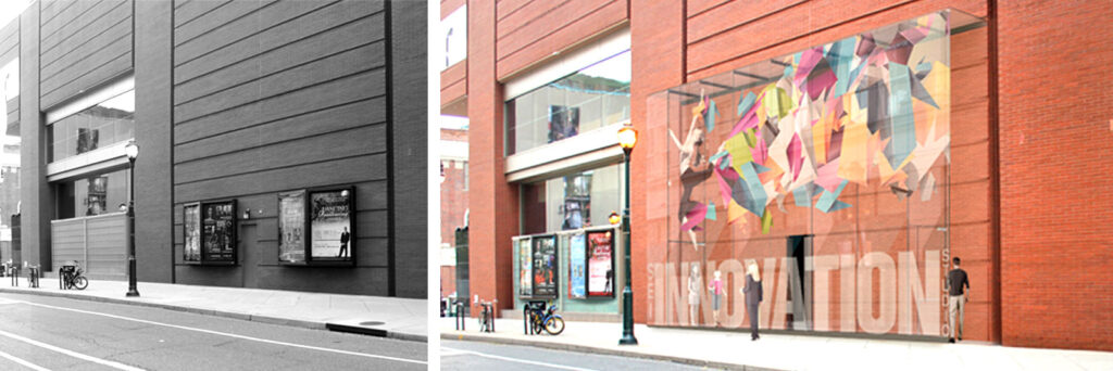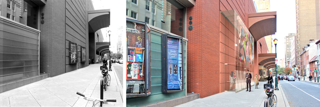 Before and after images of the entrance on Spruce Street–soon to be enclosed by structural glass overlaid with colorful, large-scale graphics.