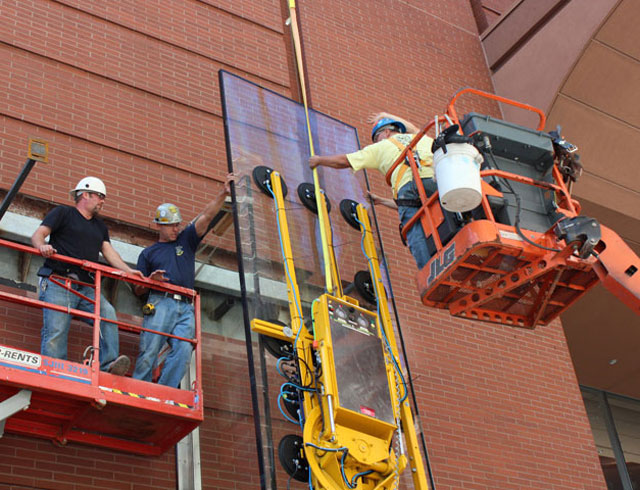 Specialized suction-cups are used to lift the 22-foot glass panels for the entryway on Spruce Street.