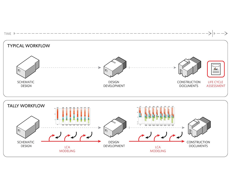 In contrast to the traditional design workflow, Tally offers the ability to assess the life cycle impacts of materials throughout the design process, rather than undergoing LCA following design completion. ©KieranTimberlake
