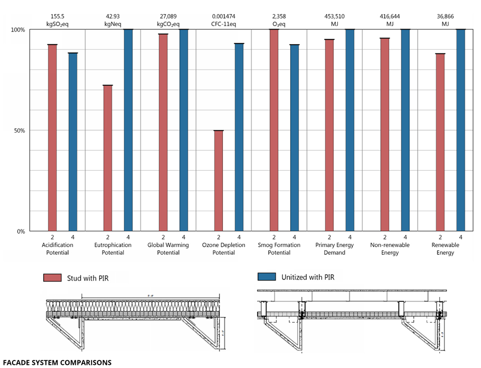 Once the structural materials were decided upon, designers then used Tally to inform the building envelope’s details. “This portion of the analysis was much more closely tied to the IPD process,” Efrie Friedlander, an environmental researcher on the project, said. “We were able to model the standard construction practices of the contractor as a baseline, and then compare options against that baseline to see where we could make improvements.” Starting by comparing a stud wall to a unitized curtainwall assembly, the team determined that the stud wall construction had fewer impacts across environmental indicators including acidification potential, eutrophication potential, and ozone depletion potential. With further examination, they determined that the largest contributor to the building envelope’s impacts was the envelope’s insulation system. By adjusting the insulation choice from PIR board to mineral wood board, the global warming potential of the building was reduced by an additional 6%, garnering savings comparable to one quarter of the energy use of a typical American home in one year.