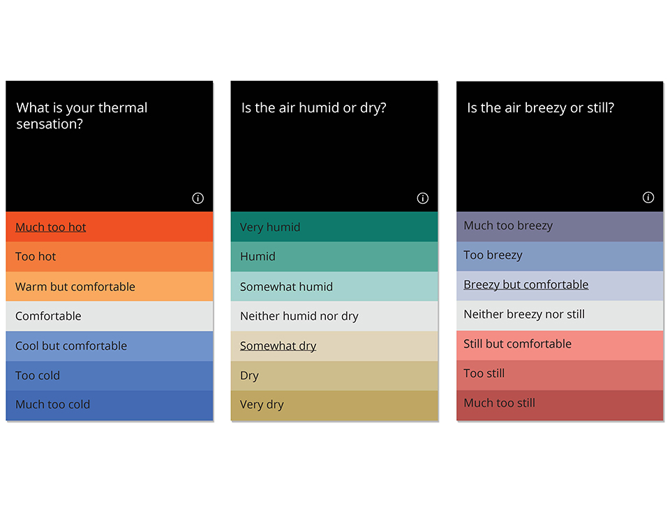 To tie those data points to human feedback, we released office-wide surveys that asked people how they were feeling (“too hot,” “warm but comfortable,” “neutral,” etc.), where in the office they were located, and what they were wearing to understand which factors contributed most to their comfort.
