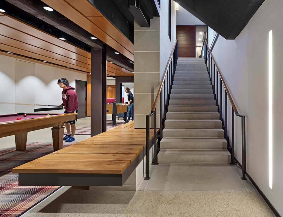 Pendleton West at Wellesley College was constructed using textured wood and concrete to capture light and shadow. ©Bob O’Connor