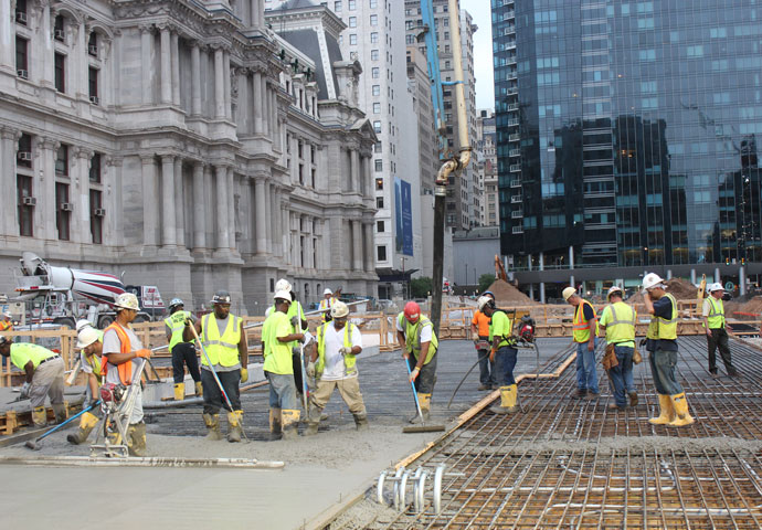 In the early morning hours of July 11, a major concrete pour raised progress on the Dilworth Plaza renovation to a new level—quite literally. Previously, work on the plaza at Philadelphia’s City Hall had been restricted to the transit concourse below ground. Now, with the addition of a roof over the north concourse, the floor of the plaza has been formed, and work can continue on the two levels simultaneously.