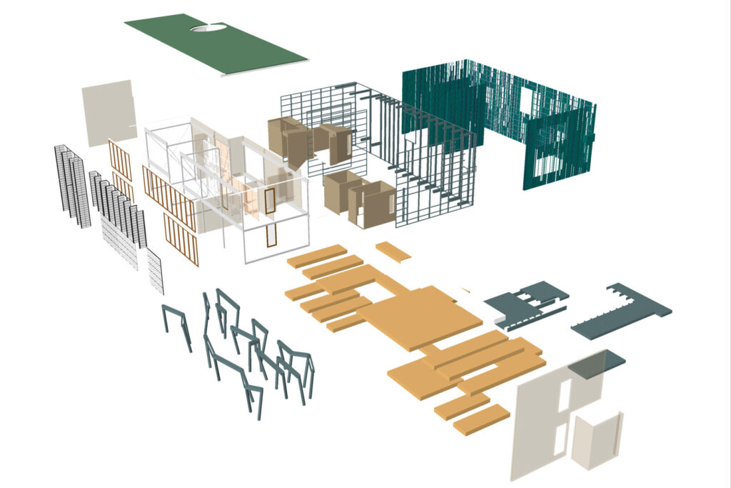 To test the viability of design for disassembly, we performed a virtual house disassembly/reassembly. We also examined the embodied energy and carbon footprint analysis and created a design-for-reassembly scenario to evidence the potential of a near 100 percent waste-diversion design intent.