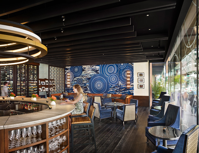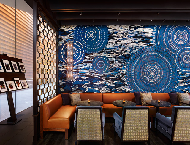 Themes of craft, travel, and the art of cooking are woven throughout the restaurant, reflected in exquisite details such as a woven wood lamp by David Trubridge, custom furnishings and cabinetry by Marguerite Rogers Editions, and a rotating gallery of Jose Garces’ travel photographs. Central to the experience are works by local artists, including a wall sculpture by Jessica Drenk, a commissioned painting by Sabine Friesicke, a pair of carved wood painted panels by Darrell Copeland, and a textile art installation by Conrad Booker.