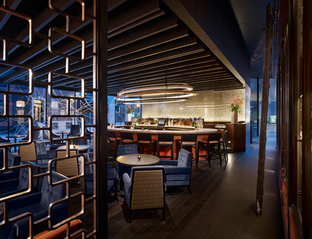 A lounge at the front of the space offers a more casual dining option, with continued transparency along Spruce Street and views to the city. © Barry Halkin