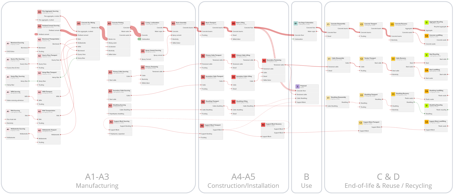 Through hotspot analysis, we identified portland cement as the largest remaining carbon contributor even after dramatic reductions—guiding the team toward biomineral substitutes that could achieve an additional 14% savings. We mapped the sensitivity of emissions to manufacturing location, transportation distance, and grid decarbonization scenarios, revealing that strategic siting in low-carbon electricity grids could reduce emissions by 6%, while clean energy procurement and zero-emission vehicle shipping could achieve 13% additional savings.