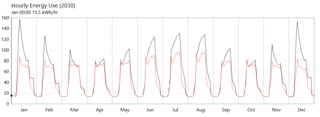 For operational carbon, we developed a methodology accounting for covariance between hourly electricity demand and grid emission factors using NREL’s Cambium datasets. Analysis showed that PV arrays covering approximately 60% of roof area could offset 100% of annual energy demand, with comercial-scale battery energy storage systems enabling strategic load-shifting when grid emissions are highest.