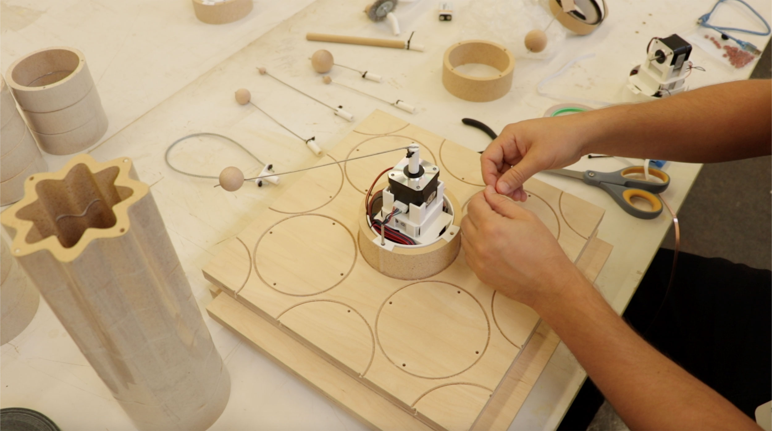 Scrapers and mallets were designed to fit within the cylinders, controlled with capacitive touch sensors to operate the variable speed step motors that drove the percussive elements.