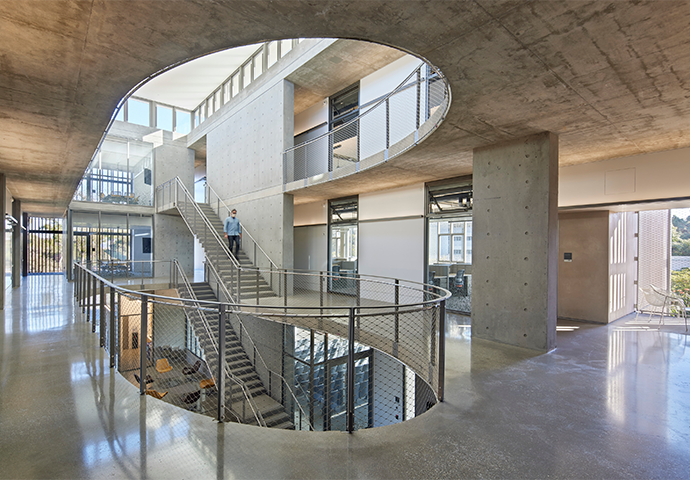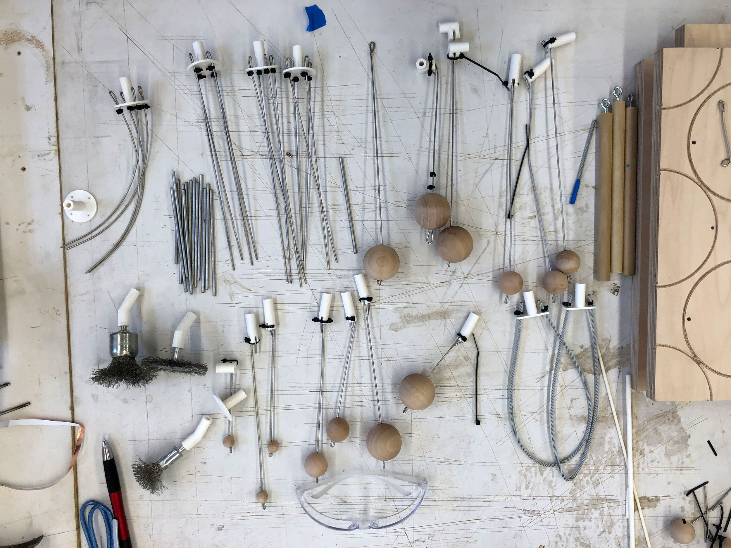 The team prototyped, tested, and tuned the cylinders to produce diverse sounds. Using a CNC waterjet cutting machine to cut precise forms, the interiors of the cylinders were articulated with ridges, bends, and notches. Using piezo microphones and other audio equipment, the team tested each cylinder with whisks, dowels, wire brushes, and wooden and metal mallets. Some sounds were bell-like and twinkled while others sounded like a food processor or rotary phone. Some effector-and-cylinder combinations produced no noise at all, or simply would not fit together.
