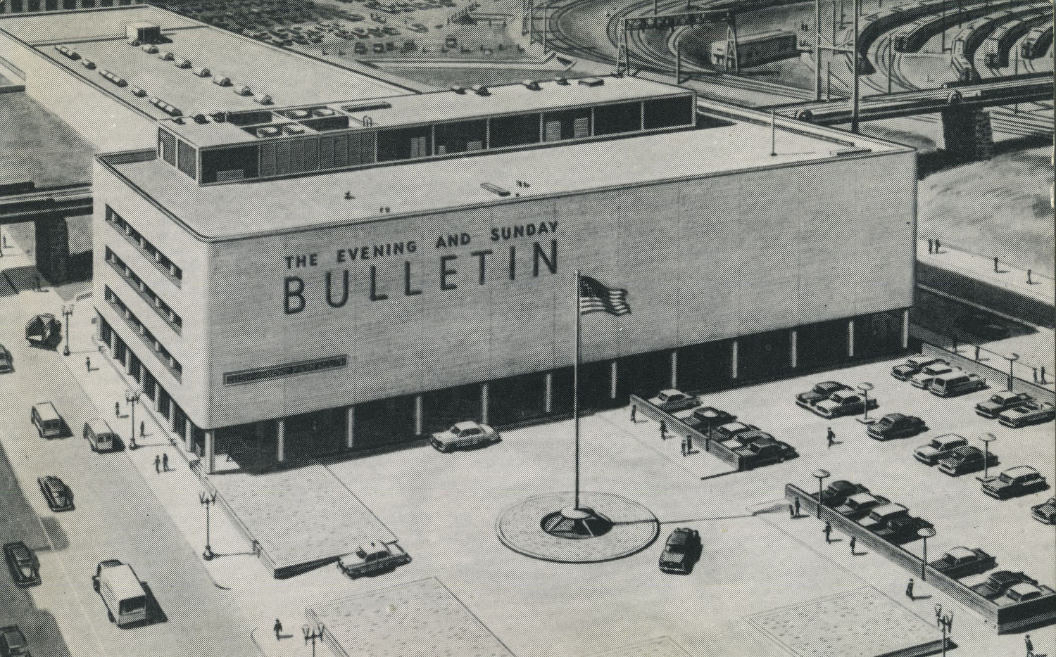 Designed by George Howe and opened in 1955, the Bulletin Building served as headquarters of The Evening Bulletin. | Courtesy of the Free Library of Philadelphia, Print and Picture Collection