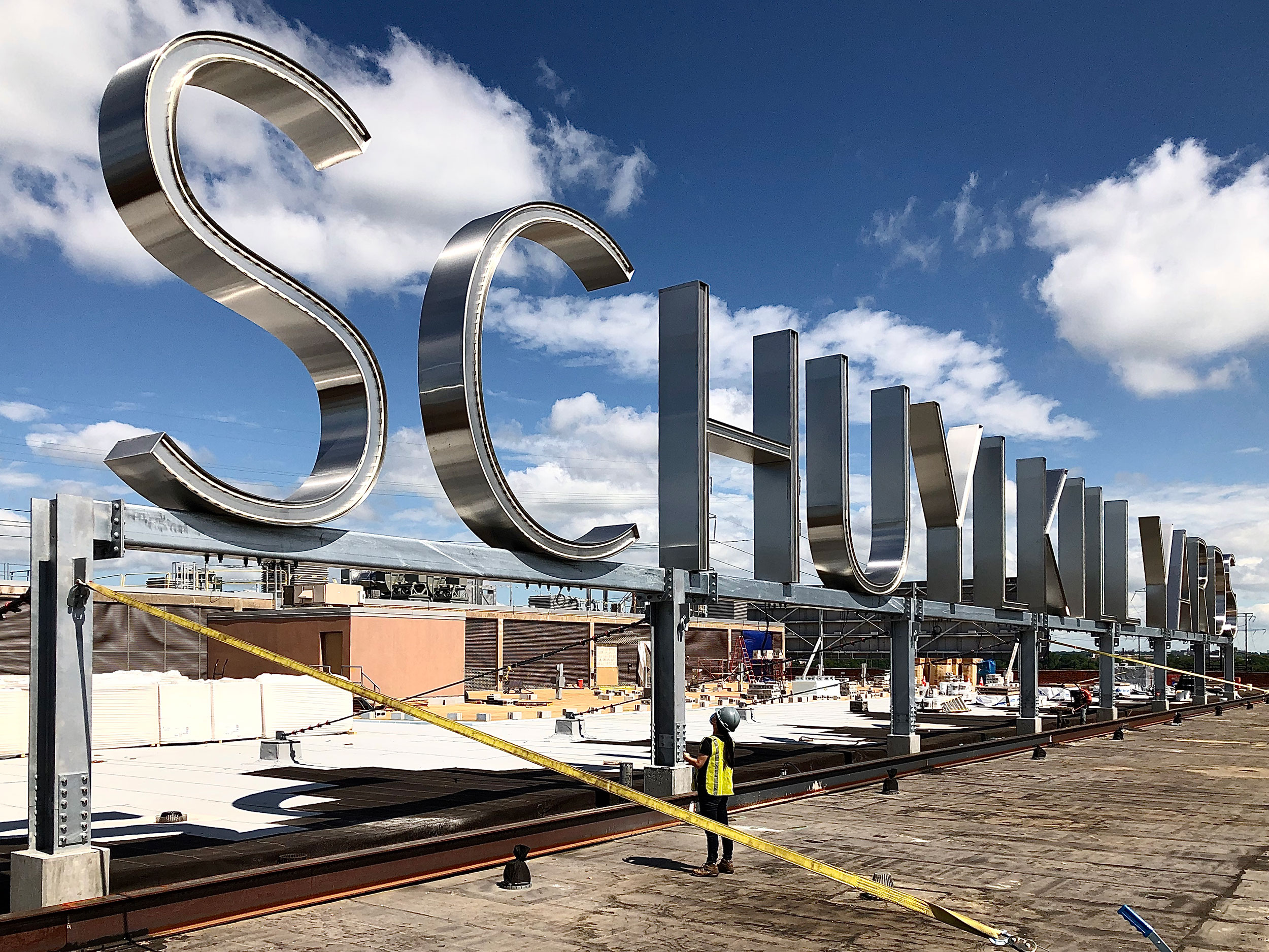 A new rooftop sign of 12-foot-tall, free-standing stainless-steel letters recalls the bold signage of Howe’s work, while announcing Schuylkill Yards as a vital new innovation district in Philadelphia. | © Halkin Mason Photography