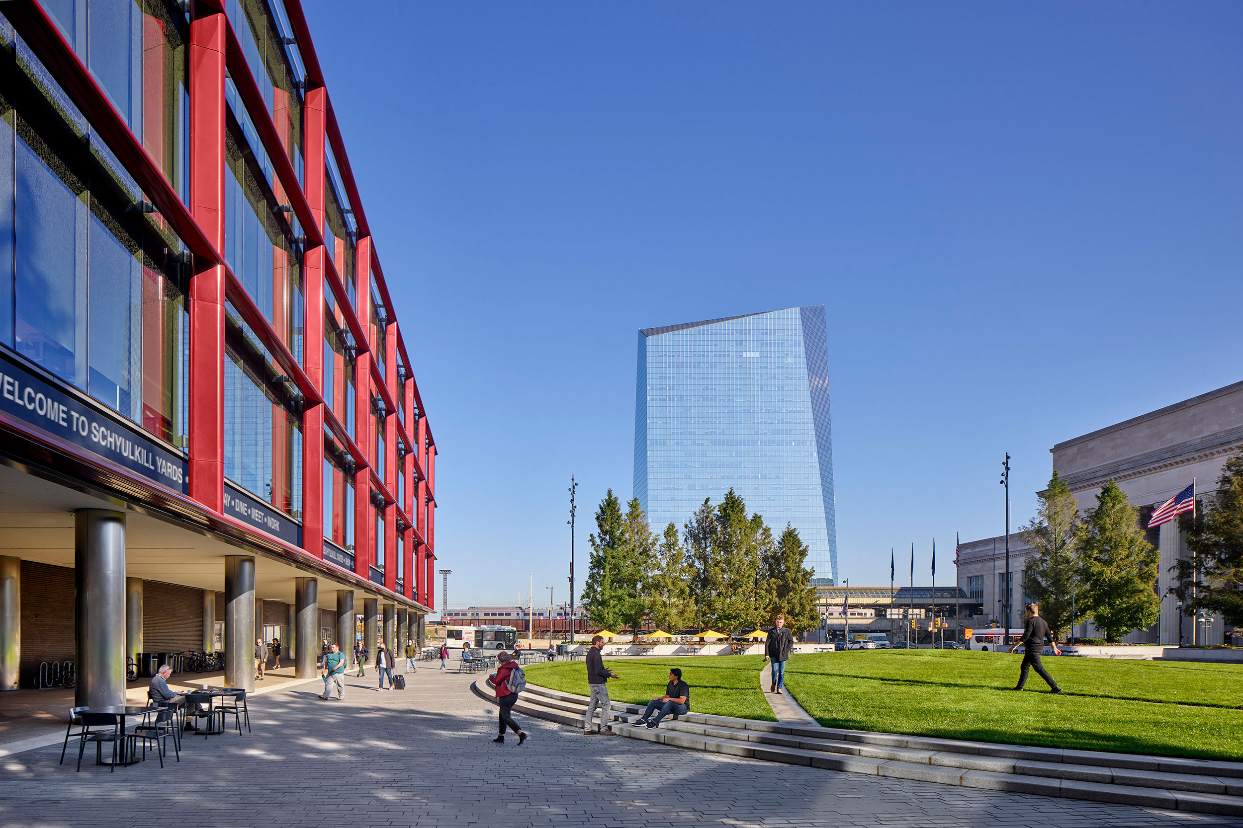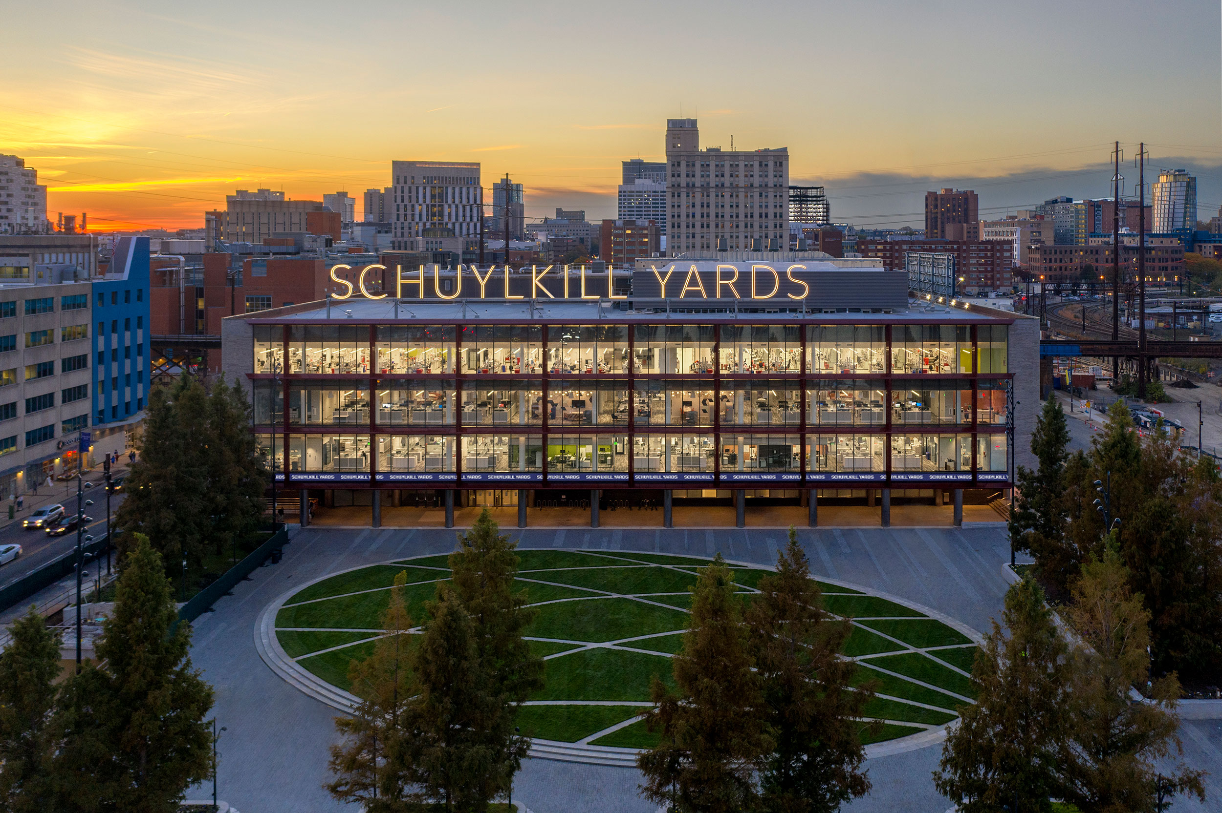 The renovated Bulletin Building, along with the adjacent Drexel Square park (replacing a surface parking lot), form a dynamic centerpiece for the Schuylkill Yards development and a memorable gateway to University City.