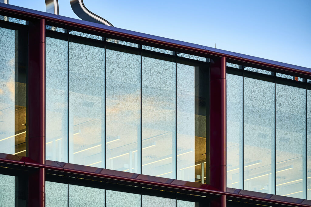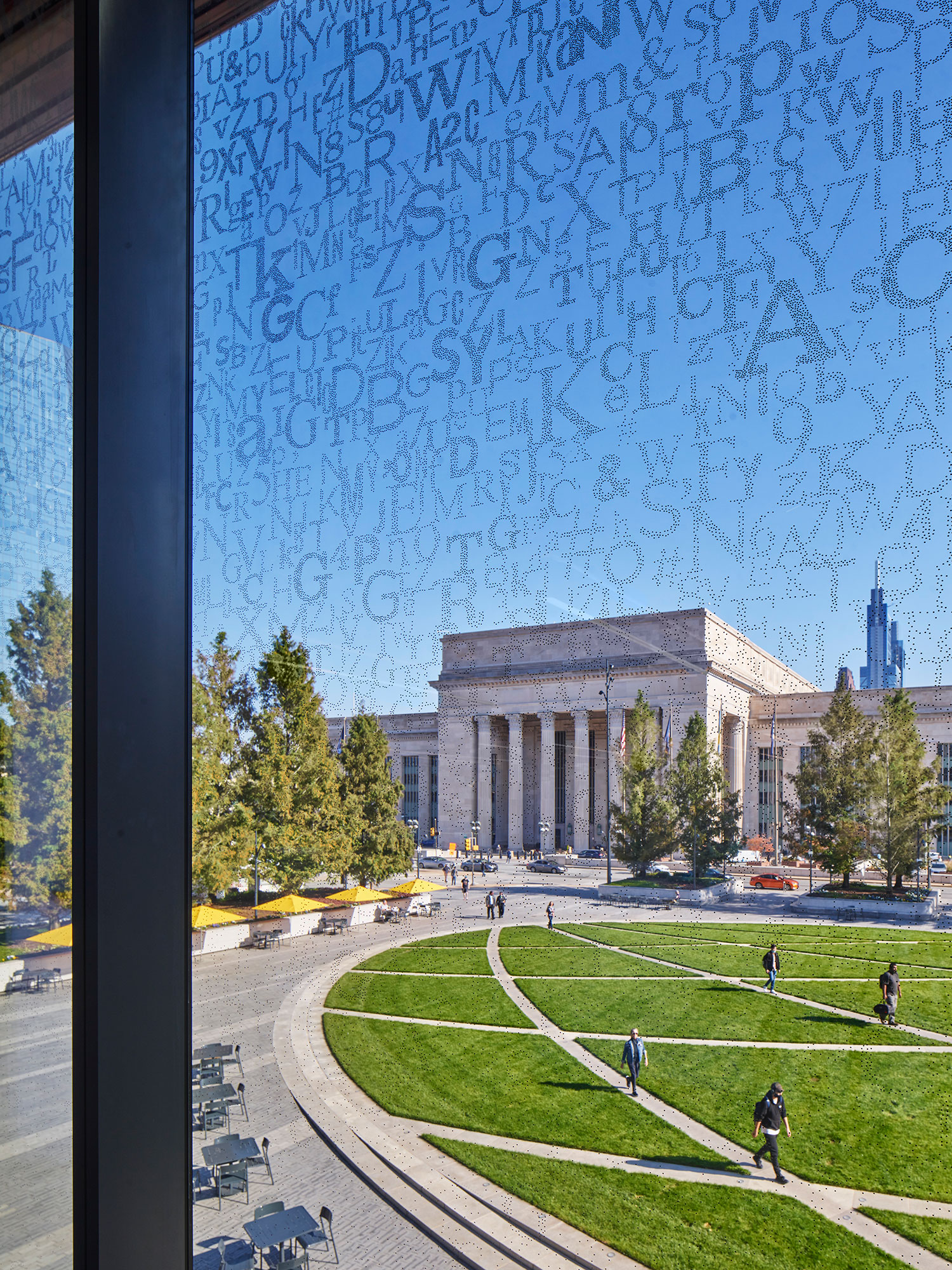 High performance glazing incorporates ceramic frit to reduce solar heat gain and make the facade visible to birds. The building’s history as a prominent news source of the print era is recalled through a composition of letters in typefaces used by The Evening Bulletin newspaper. | © Halkin Mason Photography