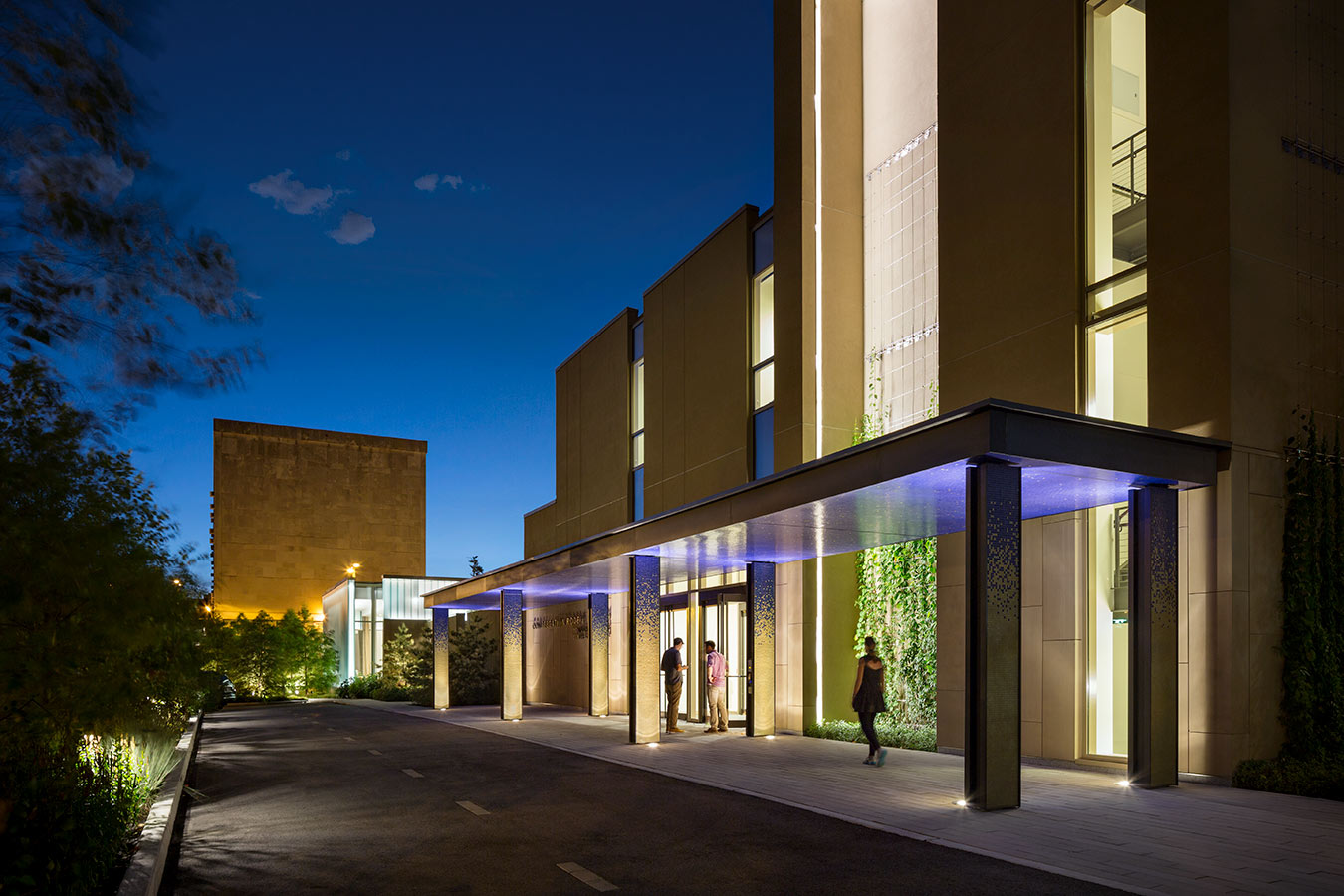 The newly landscaped stretch along Green Street redefines the campus. A cluster of bald cypress trees filter light and views to and from the new community room. ©James Ewing Photography