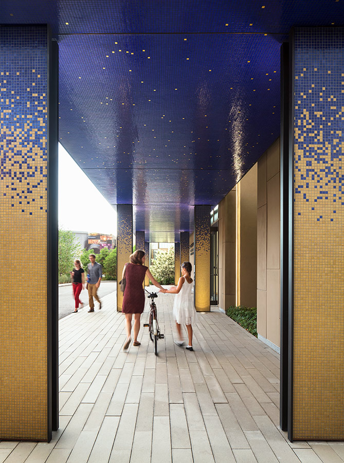 An entry loggia includes columns clad in bronze and mosaic tile, references to the rich detailing on the Broad Street face of the original building. ©James Ewing Photography