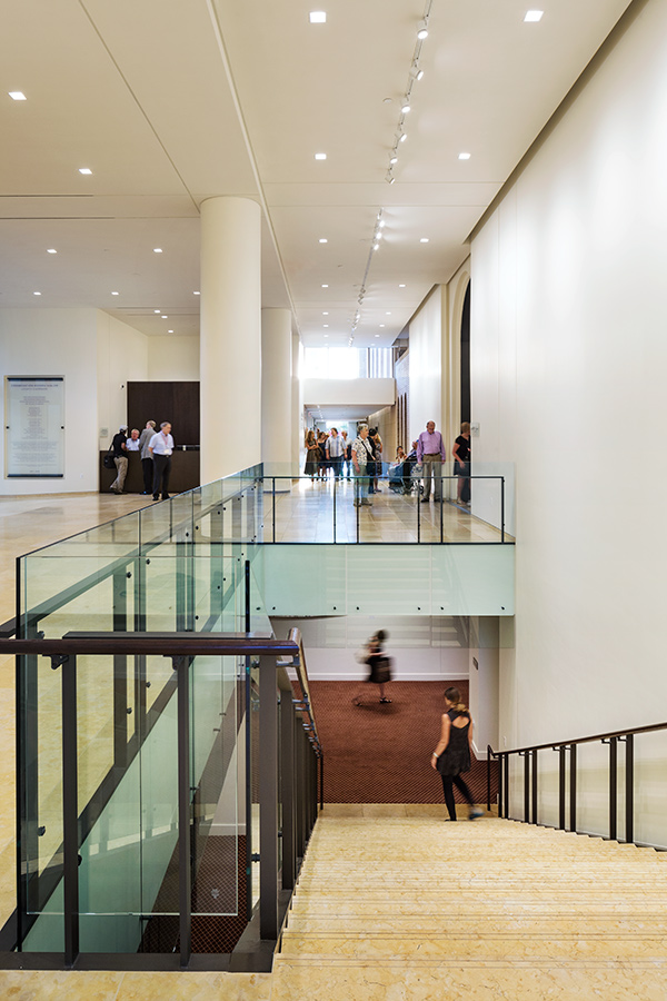The new southern entrance’s lobby provides direct connections to the historic Thalhemier Lobby, as well as all of the synagogue’s religious, educational, meeting, and social spaces. ©James Ewing Photography