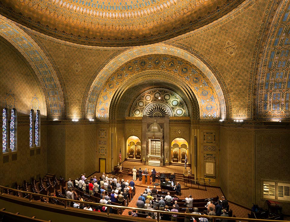 Founded in 1795, Rodeph Shalom is the oldest Ashkenazic congregation in the Western Hemisphere. Its current synagogue, listed on the National Register of Historic Places, was designed by Philadelphia architecture firm Simon & Simon and completed in 1928. An outstanding example of Byzantine revival architecture, the synagogue features a limestone-clad exterior and a lavish interior with entryway mosaics, elaborate marble flooring, and hand-painted decorative stenciling.