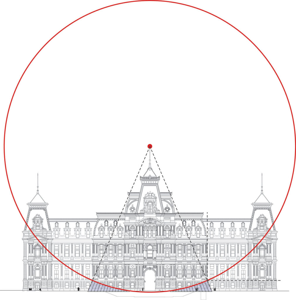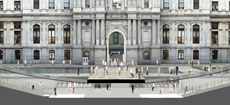 The transparent pavilions, counterpoised to the north and south of the central artery, appear to emerge from underground and are joined through a single arcing gesture that frames views of City Hall. Whereas before the concourse was dim and unwelcoming, the transparency of the glass allows light to flow into the new concourse, which is reorganized to provide clear and unencumbered access to public transportation. Out of respect for the singular materiality of City Hall, a structure built entirely of stone, the pavilions are constructed solely of uninterrupted laminated structural glass, without metal or glass fins supporting the walls or roofs. They reach nearly 20 feet in height and span the 17-foot width of the stair access to the transit hub below.