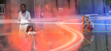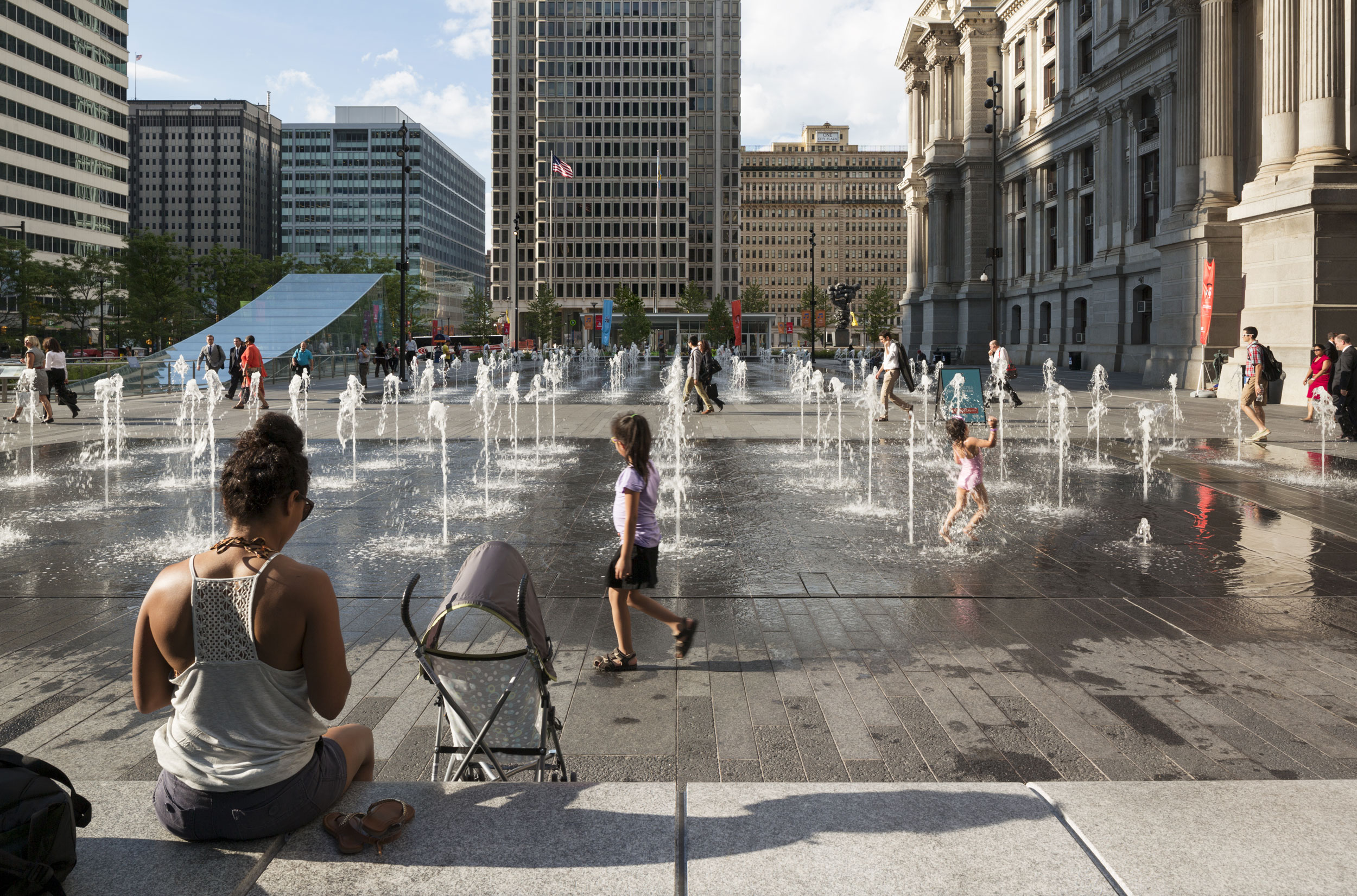 The public fountain, made up of 3/8-inch sheets of water fed by collected and purified rainwater, attracts citizens of all ages to the park. © James Ewing Photography