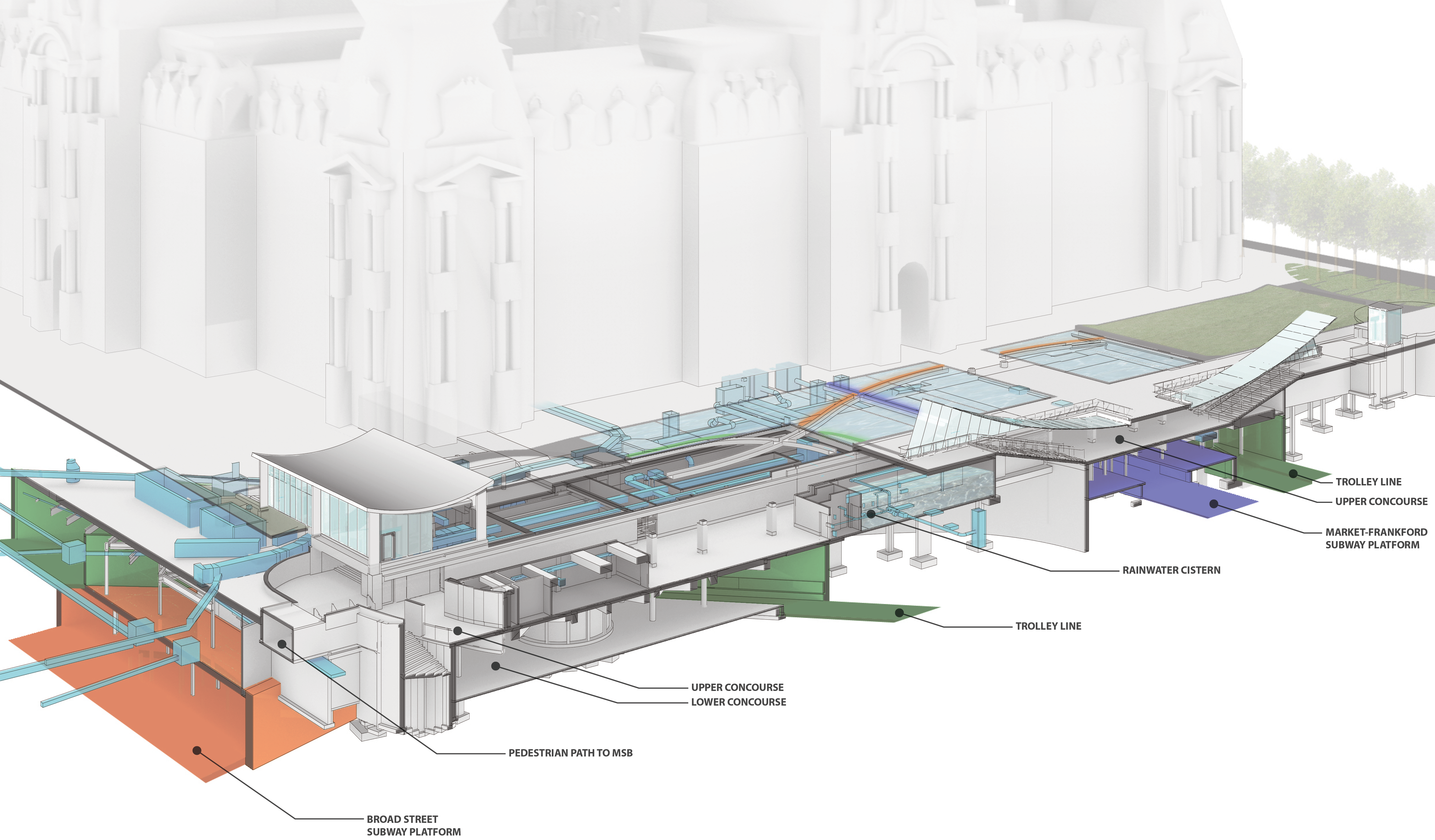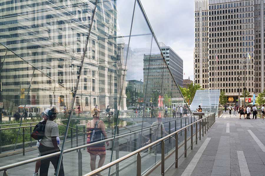 Working in collaboration with the Southeastern Pennsylvania Transportation Authority (SEPTA), we re-envisioned the intersection of the different transit systems to create a coherent experience for the 300,000 riders who pass through daily. We raised the sunken court, forming an even surface on the plaza and making a roof over the transit concourse. Glass pavilions were inserted to act as monumental entryways, signaling the transportation network below and vastly improving access to the four levels of public transit.