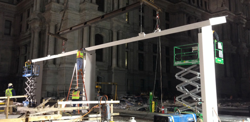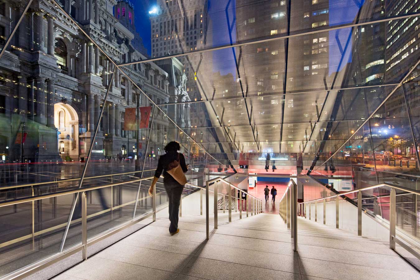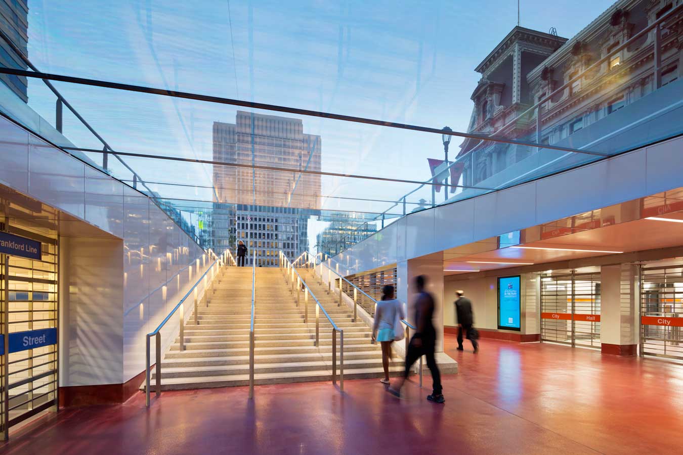 A historic nexus of transportation, Philadelphia’s City Hall is the only place in the city where all the various forms of public transit—including subway, regional rail, and trolley lines—come together. However, connections between the transit systems at this important hub were incoherent or nonexistent with the previous design. The concourse was dark, uninviting, and exposed to the elements. The area above ground, formerly known as Dilworth Plaza, consisted of a large sunken court with a series of walls and stairs that acted as barriers to pedestrians in the approach to the concourse.