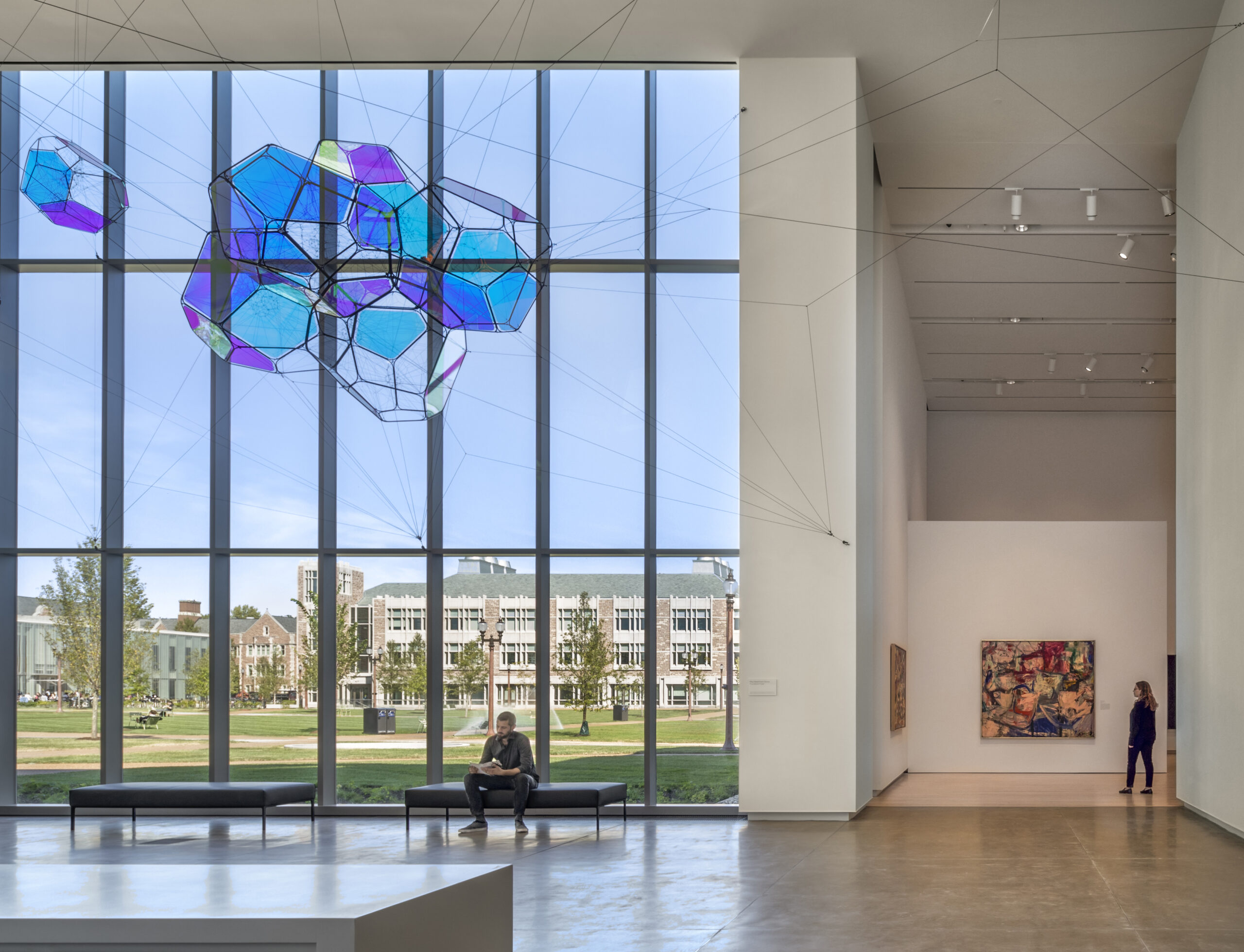 The Kemper Art Museum’s double-height lobby frames expansive views of Tisch Park and the engineering school. © Peter Aaron