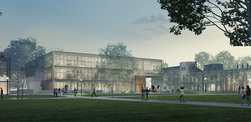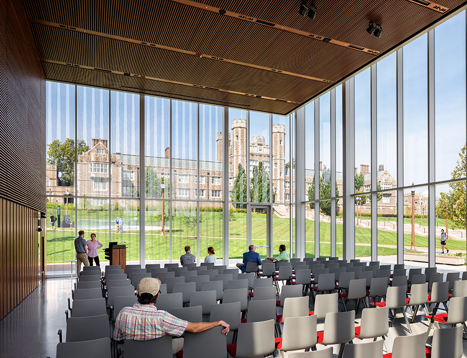 The Gary M. Sumers Welcome Center, a new building for Undergraduate Admissions and Student Financial Services, is the first stop for visitors and prospective students. The glass-enclosed building was designed to put the Welcome Center’s activity on display in addition to giving visitors upfront, personal views of the school’s distinct landscape, including the new Tisch Park, and Brookings Hall.