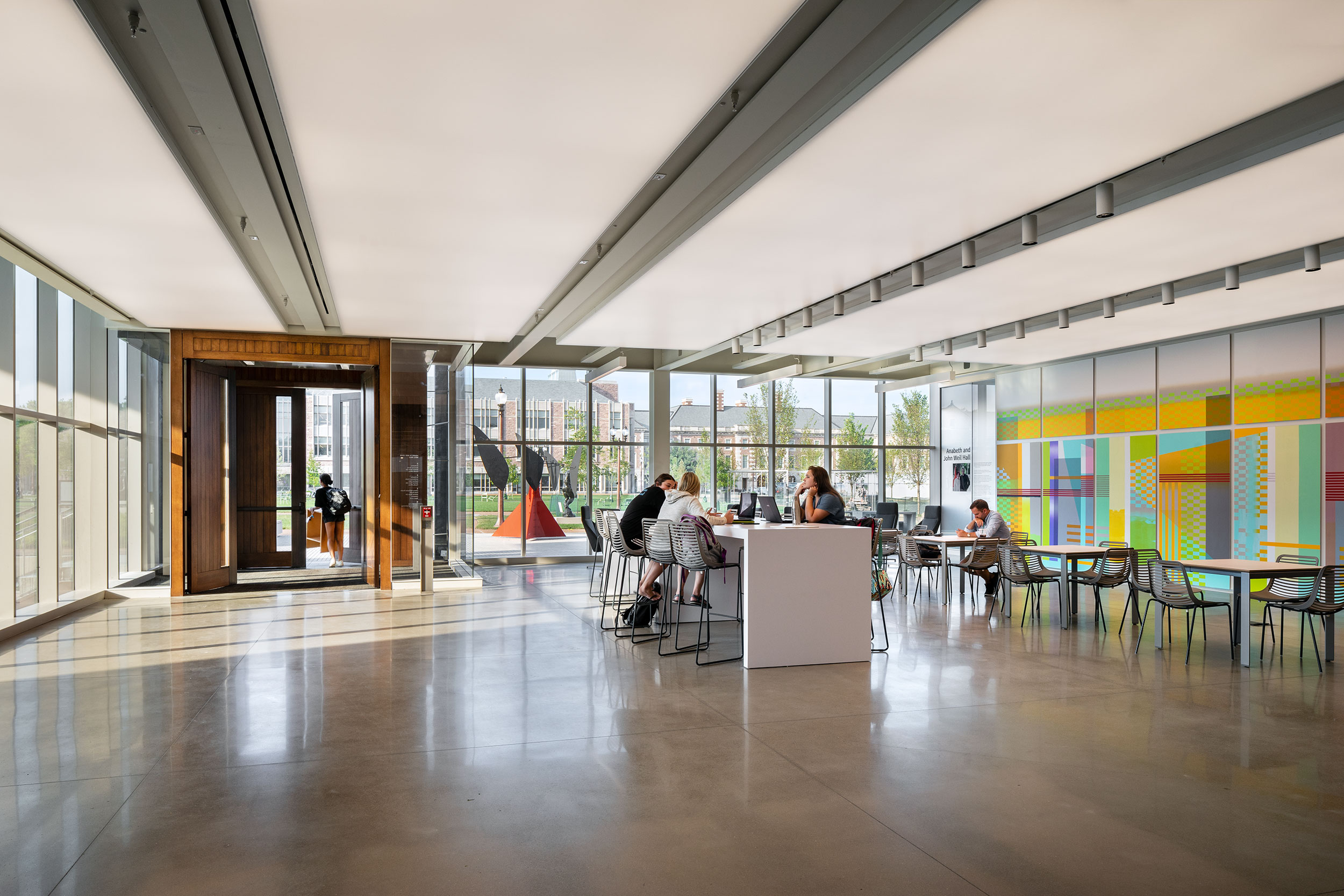The entry lobby to Weil Hall features a large wall for murals designed by alumni artists (right) and sweeping views of the Sculpture Garden and Tisch Park beyond.© James Ewing/JBSA