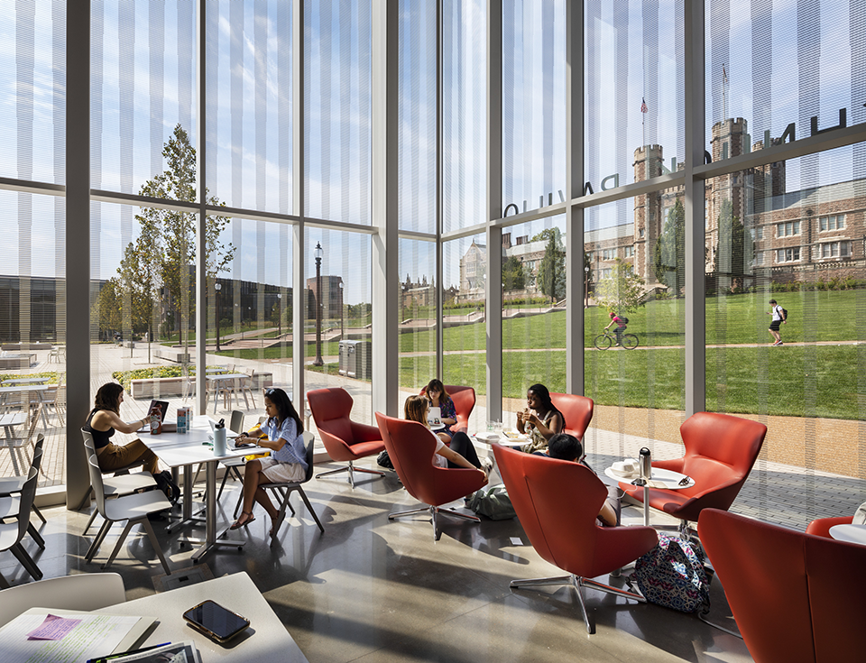 Sumers’ companion building, the Craig and Nancy Schnuck Pavilion, houses a large café and a bike hub in addition to the university’s Environmental Studies Program and Office of Sustainability. Together, the two new glass pavilions frame the towers of Brookings Hall beyond.