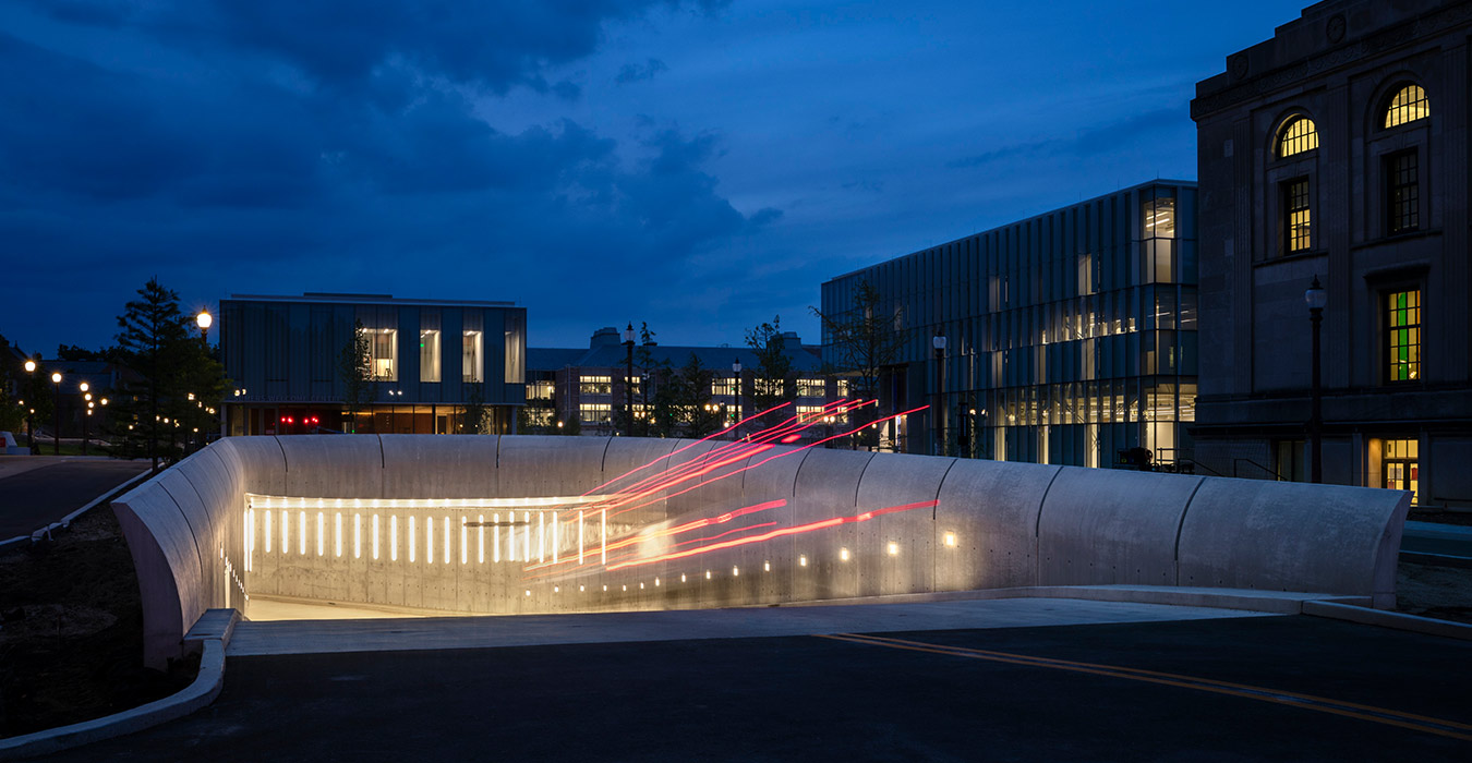 A new underground parking garage allows nearly six acres of impervious surface parking to be replaced with lawns, trees, and plantings. It also orients visitors, increases access to the new East End, and promotes low-carbon transportation by providing electric vehicle charging stations, designated car-share parking, and a campus shuttle stop.