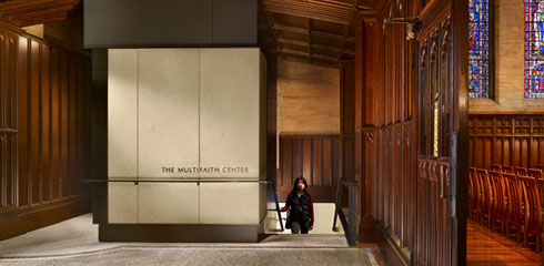If Houghton Memorial Chapel, completed at the end of the nineteenth century, gave architectural form and symbolic substance to an originating Protestant majority, a new Multifaith Center in the crypt beneath the historic chapel gives symbolic presence and new form to the multiplicity of twenty-first century faith. © Halkin Photography LLC