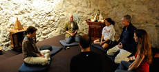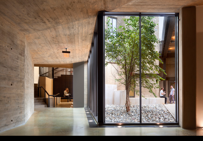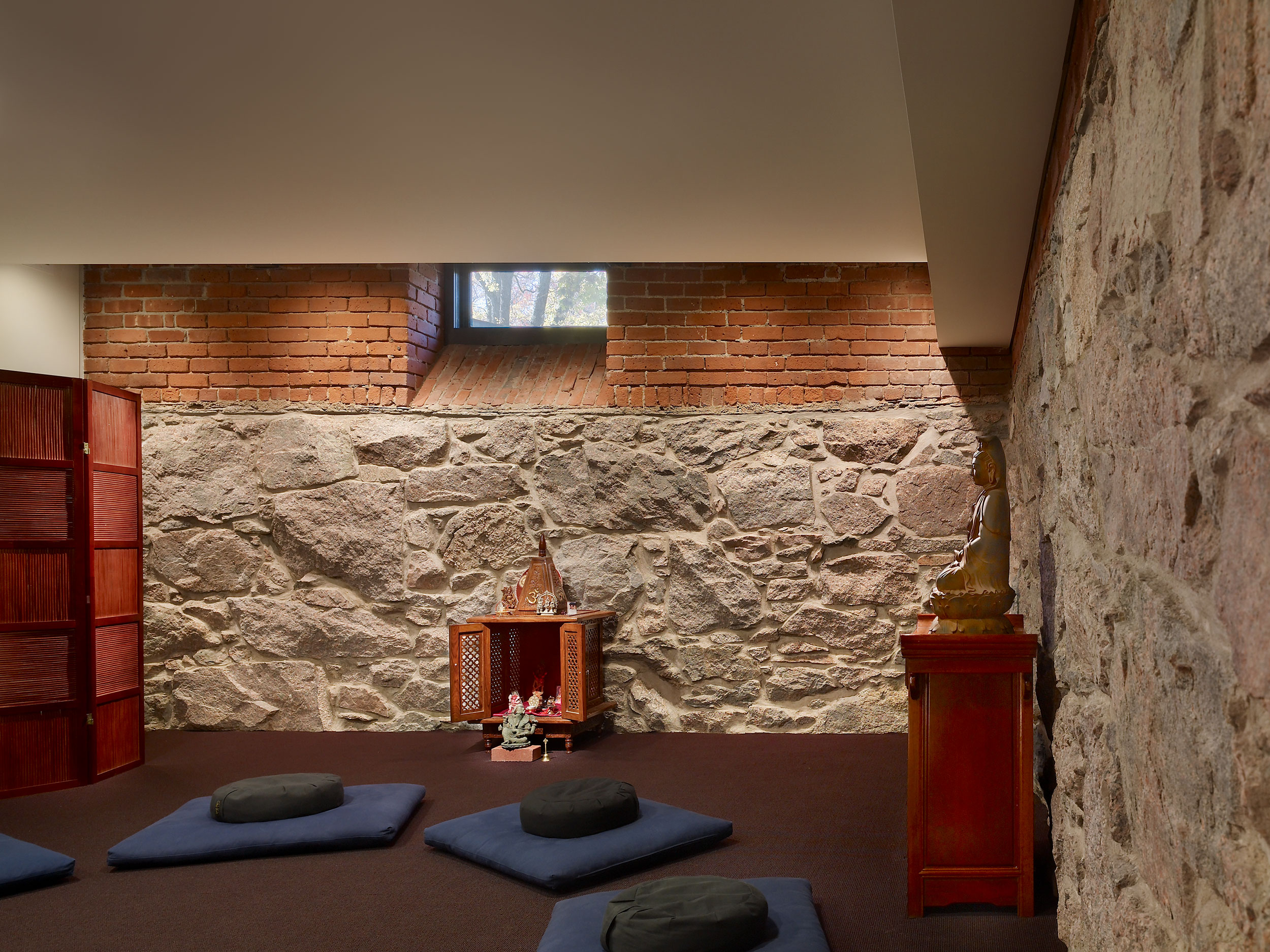 The meditation room is a quiet space enclosed by the original walls of the crypt. © Halkin Photography LLC